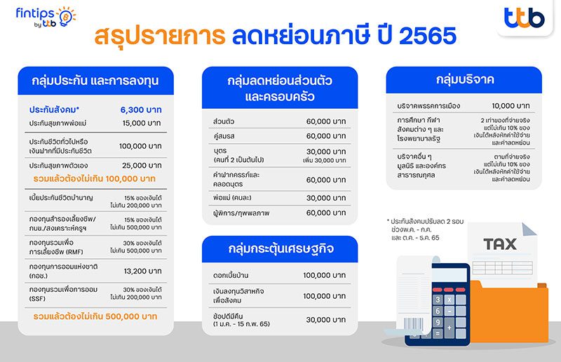 วันนี้ fintips by ttb ขอนำเสนอ รายการลดหย่อนภาษี ปี 2565 มีอะไรบ้าง สามารถอ่านครบ จบ ในที่เดียวได้เลย เริ่มจากพื้นฐานความรู้เรื่องการเสียภาษี ว่ารายได้เท่าไหร่จึงต้องเสียภาษี คำตอบคือ มนุษย์เงินเดือนที่มีรายได้ทั้งปีตั้งแต่ 316,300 บาทขึ้นไป หรือประมาณ 26,359 บาทต่อเดือน แต่นั่นก็ไม่ได้เป็นการ การันตีว่าการมีรายได้เท่านี้ต้องเสียภาษีเสมอไป เพราะในชีวิตจริงเราสามารถใช้ตัวช่วยลดหย่อนภาษีอื่น ๆ เพื่อให้เราเสียภาษีน้อยลง หรือไม่เสียภาษีเลยได้ การยื่นภาษีเงินได้บุคคลธรรมดานั้น สามารถยื่นแบบเอกสาร ณ สำนักงานสรรพากรพื้นที่สาขาทุกแห่ง ภายในวันที่ 31 มีนาคม 2566 หรือจะยื่นแบบออนไลน์ผ่านเว็บไซต์กรมสรรพากร www.rd.go.th ก็ได้เช่นกัน ซึ่งหากยื่นแบบออนไลน์จะสามารถยื่นได้จนถึงวันที่ 8 เมษายน 2566