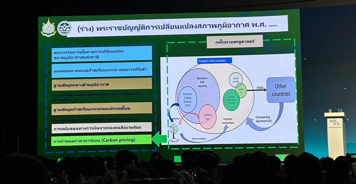 วราวุธ ให้มุมมองว่า ในอดีต น้ำมันถูกเรียกว่า Black Gold แต่ปัจจุบัน เรากำลังเปลี่ยนผ่านสู่ Green Gold หรือ คาร์บอนเครดิต ซึ่งมีอิทธิพลในสังคมโลกมากขึ้น ในส่วนของกลไกทางด้านกฎหมายของประเทศไทย ได้มีการผลักดัน “พระราชบัญญัติการเปลี่ยนแปลงสภาพภูมิอากาศ” ซึ่งจะมีการกำหนดว่าแต่ละภาคส่วนทั้งภาคธุรกิจ ภาครัฐ ภาคประชาชน จะมีโควต้าปล่อยก๊าซเรือนกระจกหรือคาร์บอนฟุตปรินท์ได้เท่าไหร่ โดยรวมกันแล้วทุกภาคส่วนทั้งประเทศต้องไม่เกิน 120 ล้านตัน รวมถึงมีการกำหนดราคาของคาร์บอนด้วย