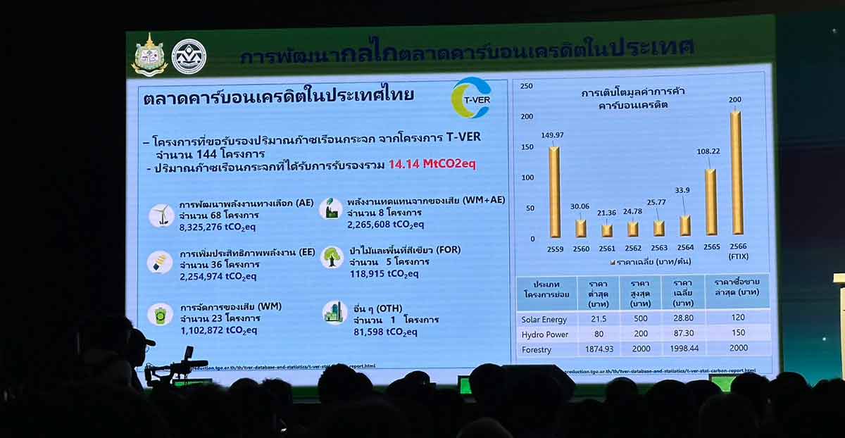 มีโครงการที่ผ่านการประเมินแล้ว 144 โครงการ ทั้งภาครัฐและภาคเอกชน ไม่ว่าจะเป็นโครงพัฒนาพลังงานทางเลือก การกำจัดของเสีย การเพิ่มพื้นที่ป่าไม้ พลังงานจากของเสีย และมาจนถึงวันนี้ มีการซื้อขายคาร์บอนเครดิตไปประมาณ 2 ล้านตัน คิดเป็นเงิน 154 ล้านบาท จากราคาตันละ 74-75 บาท ในขณะที่ทางฝั่งสหภาพยุโรปมีราคาตันละ 80 ยูโร