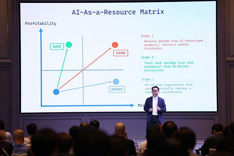 โดยภาคธุรกิจสามารถนำเมทริกซ์ AI as a Resource ที่มี 3 ขอบข่าย (Scope) การดำเนินงาน ซึ่งประกอบด้วย ขอบข่ายที่ 1 การลงทุนใช้จ่าย (Spending) เกี่ยวกับ AI เพื่อเพิ่มผลิตภาพ ขอบข่ายที่ 2 การประหยัดต้นทุน (Saving) จากความริเริ่มที่ขับเคลื่อนด้วย AI และขอบข่ายที่ 3 การเติบโตของรายรับ (Earning) จากกลยุทธ์ ผลิตภัณฑ์ และบริการที่ใช้ประโยชน์จาก AI