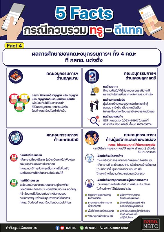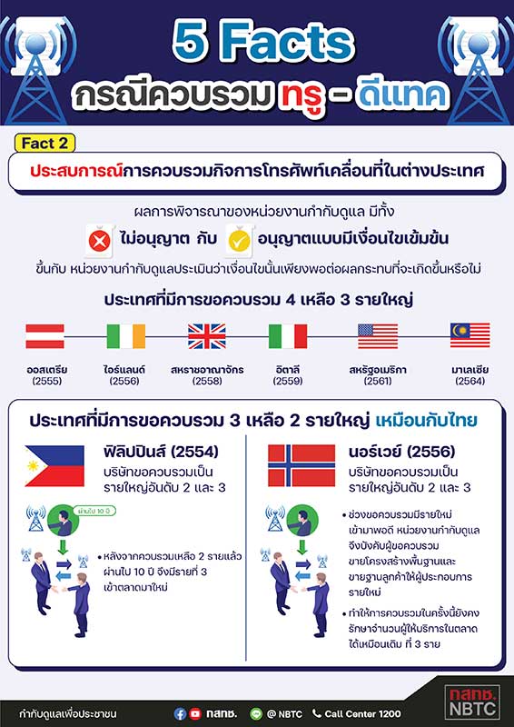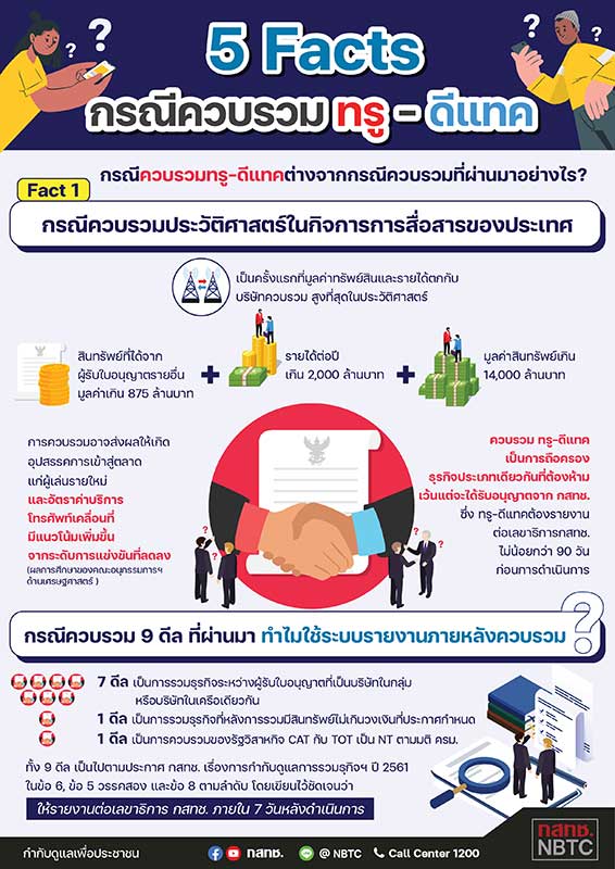 ทั้งนี้ เพื่อคลายข้อสงสัยและสื่อสารกับสาธารณะบนหลักฐานและข้อเท็จจริง สำนักงาน กสทช. จึงได้จัดทำข้อมูลในรูปแบบ Infographics ภายใต้หัวเรื่อง “5 Facts กรณีควบรวมทรู-ดีแทค” และเผยแพร่ผ่านช่องทางการสื่อสารต่างๆ โดยมีรายละเอียดโดยสังเขปดังต่อไปนี้