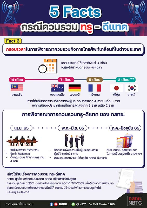 Fact ที่ 3 – กรอบระยะเวลาในการพิจารณาการควบรวมกิจการโทรศัพท์เคลื่อนที่ในต่างประเทศที่ผ่านมา มีตั้งแต่ใช้เวลา 3 เดือน จนถึงไม่กำหนดกรอบระยะเวลา ซึ่งประเทศเหล่านั้นเป็นการขอรวมธุรกิจภายใต้บริบทจากผู้ประกอบกิจการ 4 ราย เหลือ 3 ราย ส่วนของประเทศไทยนั้นเป็นการขอรวมธุรกิจจาก 3 ราย เหลือ 2 ราย จึงอาจจำเป็นต้องพิจารณาด้วยความรอบคอบและรัดกุมยิ่งขึ้น ซึ่งปัจจุบันอยู่ในระหว่างสำนักงาน กสทช. ขอขยายระยะเวลาในการปรับปรุงแก้ไขรายงานฯ ตามข้อสั่งการของที่ประชุมที่ให้หาข้อมูลเพิ่มเติมเพื่อให้ กสทช. พิจารณาในขั้นสุดท้าย