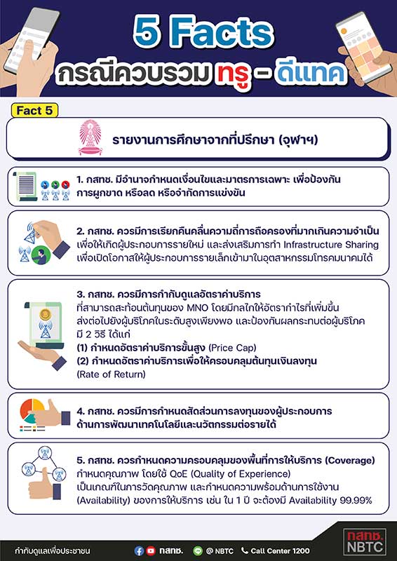 Fact ที่ 5 – สำนักงาน กสทช.ได้ดำเนินการจัดจ้างศูนย์บริการวิชาการแห่งจุฬาลงกรณ์มหาวิทยาลัยเป็นผู้ศึกษาวิเคราะห์ผลกระทบด้านต่าง ๆ จากการรวมธุรกิจระหว่างทรู-ดีแทค โดยขอบเขตอำนาจทางกฎหมายเห็นว่า กสทช.มีอำนาจกำหนดเงื่อนไขและมาตรการเฉพาะเพื่อป้องกันการผูกขาด หรือลด หรือจำกัดการแข่งขัน ในส่วนมาตรการเชิงโครงสร้างและพฤติกรรมเห็นว่า กสทช.ควรมีการเรียกคืนคลื่นความถี่การถือครองที่มากเกินความจำเป็นและควรมีการกำกับดูแลอัตราค่าบริการ กำหนดสัดส่วนการลงทุนของผู้ประกอบการด้านการพัฒนาเทคโนโลยีและนวัตกรรมต่อรายได้ รวมทั้งกำหนดความครอบคลุมของพื้นที่การให้บริการ