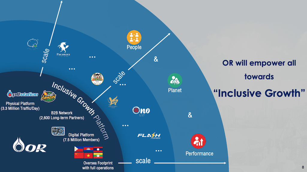 การมองหาธุรกิจใหม่ที่ตอบโจทย์เป้าหมาย 3P ได้แก่ People – การให้ผู้มีส่วนได้ส่วนเสียเข้ามาร่วมออกแบบและพัฒนาธุรกิจเพื่อการเติบโตไปด้วยกัน Planet – การพัฒนาผลิตภัณฑ์ของโออาร์ที่เป็นมิตรกับโลกและสิ่งแวดล้อม และ Performance – การสร้างผลกำไรและการเติบโตทางเศรษฐกิจอย่างยั่งยืนผ่านธุรกิจค้าน้ำมัน ธุรกิจค้าปลีก การลงทุนโดยตรงในธุรกิจต่างประเทศ รวมถึงการสร้างและบริหารความสัมพันธ์ที่ดีกับพาร์ตเนอร์