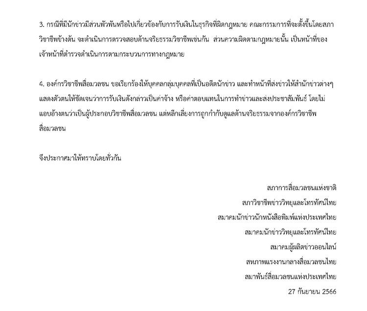 องค์กรวิชาชีพสื่อมวลชน 7 องค์กร ประกอบด้วย สภาการสื่อมวลชนแห่งชาติ สภาวิชาชีพข่าววิทยุและโทรทัศน์ไทย สมาคมนักข่าวนักหนังสือพิมพ์แห่งประเทศไทย สมาคมนักข่าววิทยุและโทรทัศน์ไทย สมาคมผู้ผลิตข่าวออนไลน์ สหภาพแรงงานกลางสื่อมวลชนไทย และสมาพันธ์สื่อมวลชนแห่งประเทศไทย ได้ร่วมประชุมกันและขอแสดงจุดยืนต่อสาธารณะว่า สื่อมวลชนที่รับเงินจากแหล่งข่าวเพื่อกระทำการหรือไม่กระทำการใด ๆ ถือเป็นเรื่องที่ละเมิดจริยธรรมวิชาชีพอย่างร้ายแรง ไม่สามารถยอมรับได้