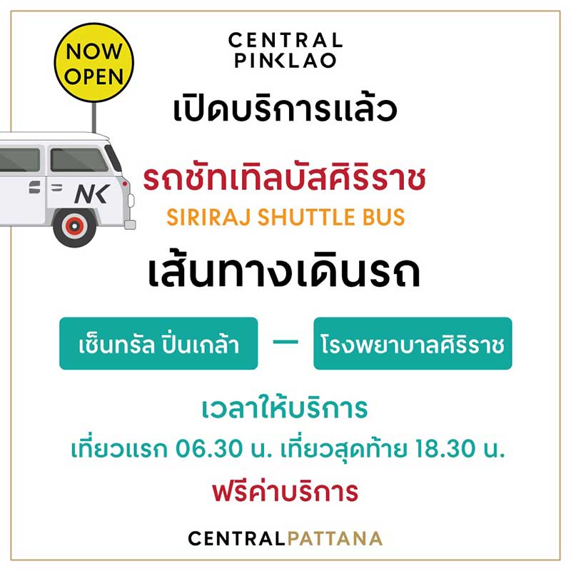 คณะแพทยศาสตร์ศิริราชพยาบาล มหาวิทยาลัยมหิดล เปิดให้บริการ “ศิริราช Shuttle Bus” นั่งจากหน้าศูนย์การค้าเซนทรัล ปิ่นเกล้า เพื่อไปลงโรงพยาบาลศิริราชฟรี