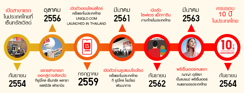 ยูนิโคล่ แบรนด์เครื่องแต่งกายระดับโลกจากญี่ปุ่น ฉลองครบรอบ 10 ปีในประเทศไทยเพื่อขอบคุณคนไทยทุกคนที่ให้การต้อนรับและสนับสนุนยูนิโคล่อย่างดีมาโดยตลอดตั้งแต่วันแรกที่ ยูนิโคล่เข้ามาในประเทศไทย ทำให้ยูนิโคล่สามารถบรรลุเป้าหมายทางธุรกิจและยืนหยัดอยู่คู่คนไทยมาตลอดจนถึงปัจจุบัน ยูนิโคล่ถือว่าการครบรอบ 10 ปี ในประเทศไทยเปรียบเสมือนหลักไมล์ความสำเร็จทางธุรกิจ เป็นแรงผลักดันให้ยูนิโคล่สร้างสรรค์ผลิตภัณฑ์ไลฟ์แวร์ (LifeWear) คุณภาพสูง ให้คนไทยสวมใส่ เพื่อชีวิตที่ดีกว่า