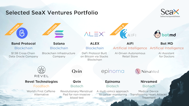 ตลอด 3 ปีที่ผ่านมา SeaX Ventures ได้ลงทุนในสตาร์ตอัพไปแล้ว 10 บริษัท และวางแผนจะลงทุนเพิ่มอีก 30 บริษัท โดยสัดส่วนการลงทุนของ SeaX Ventures จะอยู่ที่การลงทุนในสตาร์ตอัพสหรัฐอเมริกา 70% และสตาร์ตอัพในอาเซียนหรือที่อื่น ๆ รวมกัน 30% ที่ผ่านมา มี 2 Blockchain Startupsในพอร์ตการลงทุน อย่าง Solana Blockchain เจ้าของฉายา Ethereum Killer ที่กำลงมาแรงในขณะนี้ และ Band Protocol Blockchain Startup ของคนไทย ที่มีมูลค่ากว่า 5 หมื่นล้านบาท ขึ้นแท่นเป็นคริปโตคอร์น (สตาร์ตอัพยูนิคอร์นด้าน Cryptocurrency) ไปเป็นที่เรียบร้อยแล้ว