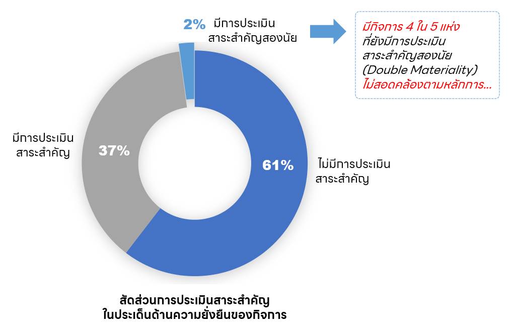 สำหรับการประเมินสาระสำคัญ (Materiality Assessment) เพื่อระบุประเด็นความยั่งยืนสำหรับการดำเนินงานและการรายงานของกิจการ พบว่า 61% ของกิจการที่ถูกสำรวจ ยังไม่มีการประเมินสาระสำคัญ ส่วนกิจการที่มีการประเมินสาระสำคัญมีจำนวน 37% และมีเพียง 2% ที่มีการประเมินสาระสำคัญสองนัย (Double Materiality Assessment)