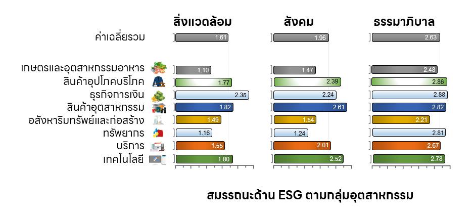 หากวิเคราะห์ข้อมูลกิจการที่สำรวจ จำแนกตามกลุ่มอุตสาหกรรม พบว่า กิจการที่ได้คะแนนการดำเนินงาน ESG รวมสูงสุดในสามอันดับแรก ได้แก่ กิจการในกลุ่มธุรกิจการเงิน (4.98 คะแนนจากคะแนนเต็ม 10) รองลงมาเป็นกิจการในกลุ่มสินค้าอุตสาหกรรม (4.83 คะแนน) และกิจการในกลุ่มเทคโนโลยี (4.73 คะแนน) ตามลำดับ