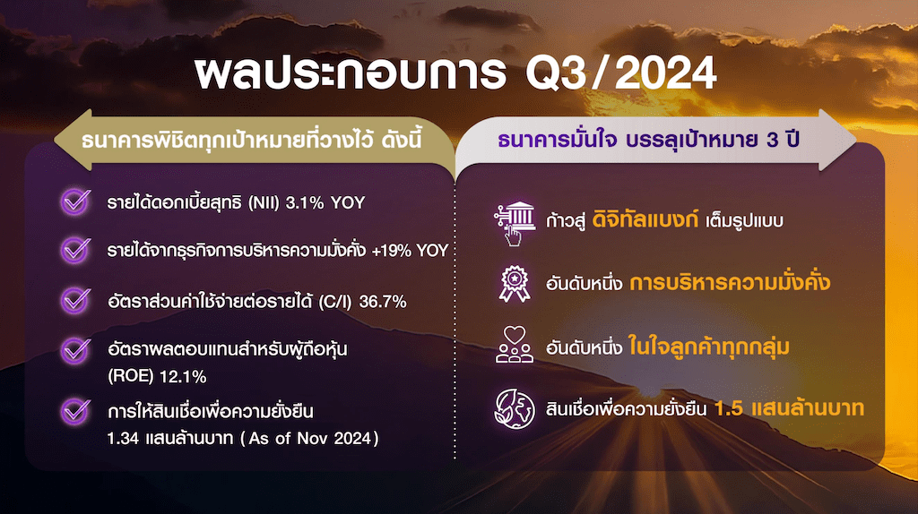 กฤษณ์ จันทโนทก ประธานเจ้าหน้าที่บริหาร ธนาคารไทยพาณิชย์ เปิดเผยว่า การดำเนินงานตามกลยุทธ์ Digital Bank with Human Touch สร้างผลการดำเนินงานที่แข็งแกร่งต่อเนื่อง และสามารถพิชิตทุกเป้าหมายที่วางได้ โดย ณ สิ้นไตรมาส 3 ของปี 2567 ธนาคารไทยพาณิชย์มีกำไรสุทธิ 3.85 หมื่นล้านบาท หรือเติบโต 5% เมื่อเทียบกับช่วงเดียวกันของปีที่แล้ว (yoy) รายได้ดอกเบี้ยสุทธิเติบโต 3.1% yoy รายได้จากธุรกิจการบริหารความมั่งคั่งเติบโต 19% yoy อัตราผลตอบแทนผู้ถือหุ้นที่ระดับ 12.1% ซึ่งสูงที่สุดเมื่อเทียบกับธนาคารขนาดใหญ่ที่มีความสำคัญต่อระบบในประเทศ (Domestic Systemically Important bank: D-SIBs) มีต้นทุนต่อรายได้ที่ 36.7% ต่ำที่สุดในระบบ D-SIBs