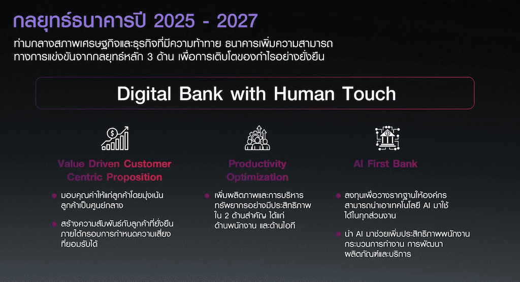 เพื่อรับมือกับความท้าทายดังกล่าว ในปี 2568 ธนาคารจึงได้วางแผนปรับทิศทางธุรกิจภายใต้กลยุทธ์ Digital Bank with Human Touch โดยมุ่งสร้างการเติบโตธุรกิจและพัฒนากระบวนการภายใน (Scale & Operate) ให้เป็นธนาคารดิจิทัลที่เหนือกว่าทั้งเทคโนโลยีและบริการ เพื่อเป็นรากฐานไปสู่องค์กรยั่งยืนจากนี้ จึงเตรียมความพร้อมเพื่อรองรับกับความท้าทายใหม่ที่จะเกิดขึ้น โดยจะให้ความสำคัญกับการสร้างคุณภาพใน 3 ส่วน คือ การมอบคุณภาพให้ลูกค้าด้วยบริการที่ตรงใจ การยกระดับคุณภาพขององค์กร และการสร้างพนักงานที่มีคุณภาพ ผ่านการปรับโครงสร้างและวิถีการทำงาน สร้างความสามารถในการแข่งขัน พร้อมพัฒนาองค์กรอย่างต่อเนื่องเพื่อการเติบโตอย่างยั่งยืน ท่ามกลางสภาวะแวดล้อมที่เปลี่ยนไป โดยจะดำเนินการบน 3 แนวทาง คือ
