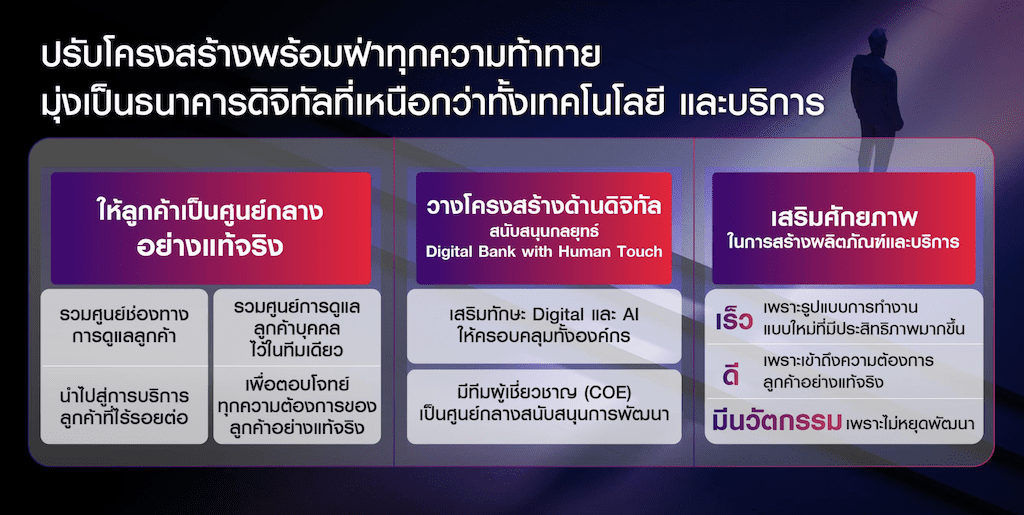 2 วางรากฐานดิจิทัลให้แข็งแกร่ง เร่งเสริมความสามารถทางด้าน Digital และ AI ให้ครอบคลุมทั้งองค์กร และแบ่งทีมดิจิทัลเป็นสองส่วน ส่วนหนึ่งเป็นผู้เชี่ยวชาญทางด้าน AI & DATA Intelligence (Center of Excellence: COE) เป็นศูนย์กลางสนับสนุนการพัฒนาทางด้านดิจิทัลโดยเฉพาะ และอีกส่วนหนึ่งจะถูกจัดลงสู่ทีมธุรกิจเพื่อส่งเสริมการพัฒนาผลิตภัณฑ์ทางการเงินของแต่ละกลุ่มธุรกิจเพื่อตอบโจทย์ลูกค้าทุกกลุ่มอย่างแท้จริง