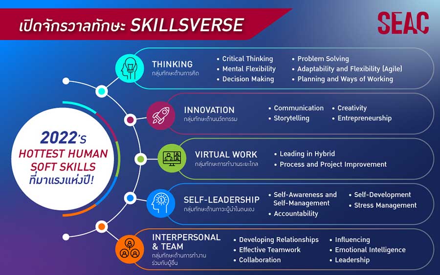 • SEAC (ซีแอค) จัดงานเสวนาออนไลน์ THE SKILLSVERSE: 2022’S HOTTEST HUMAN SOFT SKILLS เผยภาพทักษะ Human Soft Skills ที่สำคัญที่สุดของคนองค์กรแห่งปี 2022