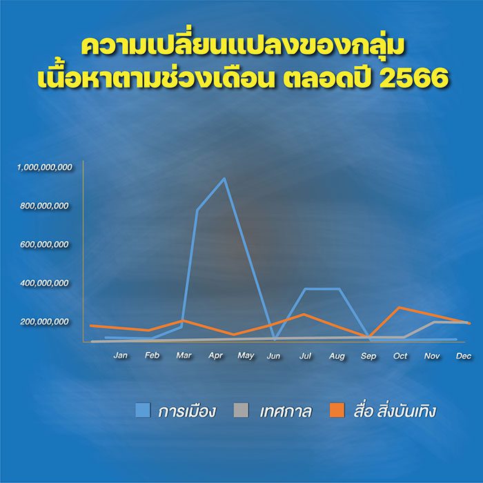 ความสนใจของสื่อสังคมออนไลน์ยังสัมพันธ์กับช่วงเวลา เช่น กลุ่มเนื้อหาทางการเมืองได้รับความสนใจสูงในช่วงเดือนมีนาคม-สิงหาคม 2566 เนื่องจากอยู่ในระหว่างการหาเสียง การเลือกตั้ง การประกาศผลการเลือกตั้ง การโหวตนายกรัฐมนตรี ไปจนถึงการได้นายกรัฐมนตรี และการจัดตั้งคณะรัฐบาล ในขณะที่กลุ่มเนื้อหาสื่อ สิ่งบันเทิงได้รับความสนใจต่อเนื่องตลอดทั้งปี สูงสุดที่เดือนตุลาคมจากกระแสภาพยนตร์สัปเหร่อ ละครพรหมลิขิต ภาพยนตร์ธี่หยด และคอนเสิร์ตที่เป็นที่นิยม ช่วงปลายปีเป็นกลุ่มเนื้อหาเทศกาลที่ได้รับความสนใจ เช่น ลอยกระทง คริสต์มาส วันขึ้นปีใหม่ ส่วนกลุ่มเนื้อหาอื่น ๆ ได้รับความสนใจปะปนกันตามช่วงที่มีข่าวหรือมีกระแสความนิยม