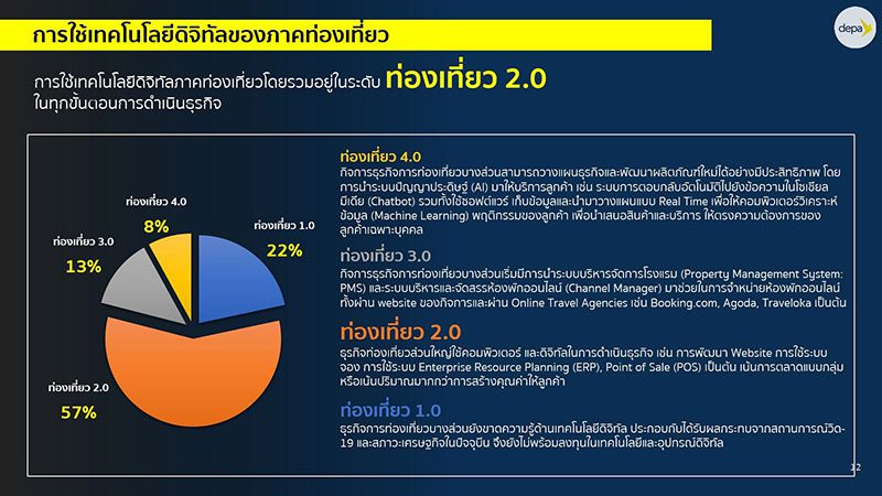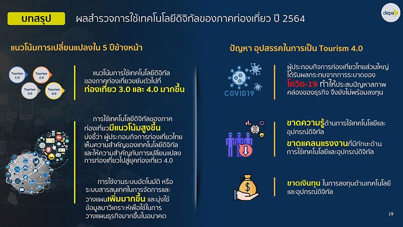 ด้าน กษมา กองสมัคร ผู้ช่วยผู้อำนวยการใหญ่ ดีป้า เปิดเผยผลสำรวจการใช้เทคโนโลยีดิจิทัลภาคการท่องเที่ยวว่า ระดับการใช้เทคโนโลยีดิจิทัลอยู่ในระดับท่องเที่ยว 2.0 ในทุกขั้นตอนการดำเนินธุรกิจ ไม่ว่าจะเป็นการบริหารความสัมพันธ์กับลูกค้าที่มีการใช้เทคโนโลยีดิจิทัลในการบริหารจัดการ และอำนวยความสะดวก การวางแผนธุรกิจและพัฒนาผลิตภัณฑ์/บริการใหม่ที่มีการใช้เทคโนโลยีดิจิทัลในการเก็บข้อมูลลูกค้าเพื่อนำมาวิเคราะห์สำหรับการวางแผนธุรกิจและการพัฒนาผลิตภัณฑ์ใหม่ การบริหารจัดการธุรกิจมีการใช้เทคโนโลยีดิจิทัลในการบริหารจัดการ การจัดการบัญชี การจัดการคลังสินค้า และการจัดการทรัพยากรมนุษย์มีการใช้เทคโนโลยีดิจิทัลในการสรรหาทรัพยากรบุคคล ระบบบันทึกเวลาเข้า-ออกงาน และการจัดการระบบบัญชีเงินเดือน