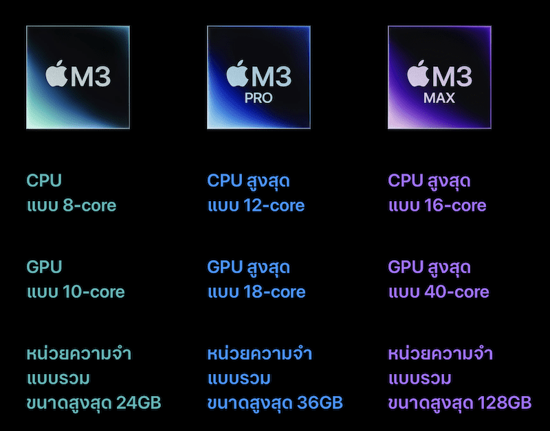 ชิปตระกูล M3 เป็นการต่อยอดนวัตกรรมที่ก้าวล้ำไปอย่างรวดเร็วของ Apple silicon โดยชิป M3, M3 Pro และ M3 Max เป็นชิปตระกูลแรกสำหรับคอมพิวเตอร์ส่วนบุคคลที่สร้างขึ้นด้วยเทคโนโลยี 3 นาโนเมตรชั้นแนวหน้าของอุตสาหกรรม ทั้งยังมาพร้อม GPU เจเนอเรชั่นถัดไปที่เร็วขึ้นและมีประสิทธิภาพยิ่งขึ้น เรียกได้ว่าเป็นก้าวกระโดดครั้งใหญ่ที่สุดเท่าที่เคยมีมาในด้านสถาปัตยกรรมกราฟิกสำหรับ Apple silicon นอกจากนี้ยังมีเทคโนโลยีระดับพลิกวงการอย่าง Dynamic Caching ซึ่ง GPU จะจัดสรรการใช้หน่วยความจำในฮาร์ดแวร์ของเครื่องแบบเรียลไทม์ เพื่อให้มีการใช้หน่วยความจำเฉพาะที่จำเป็นสำหรับแต่ละงานอย่างแม่นยำ ทั้งหมดนี้ช่วยเพิ่มระดับการใช้งานและประสิทธิภาพของ GPU ได้อีกมากสำหรับแอปและเกมระดับโปรที่ประมวลผลหนัก ๆ