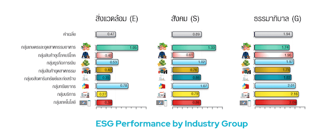 หากวิเคราะห์ข้อมูลกิจการที่สำรวจ จำแนกตามกลุ่มอุตสาหกรรม พบว่า กิจการที่ได้คะแนนการดำเนินงาน ESG รวมสูงสุดในสามอันดับแรก ได้แก่ กิจการในกลุ่มเกษตรและอุตสาหกรรมอาหาร รองลงมาเป็นกิจการในกลุ่มทรัพยากร และกลุ่มธุรกิจการเงิน ตามลำดับ