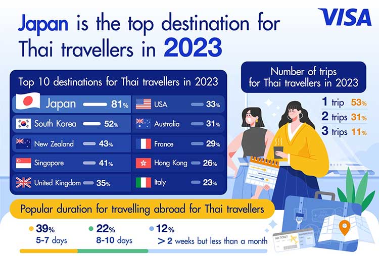 Visa, the world’s leader in digital payments, today revealed Japan, South Korea, New Zealand, Singapore and the United Kingdom make up the top five most desired international destinations for Thai travellers, according to a Thailand’s Travel Intentions Study 2023 – Outbound Edition (“the Study”).